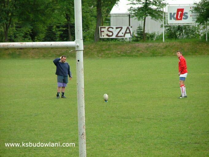 Tomasz Stępień szykuje się do kopu, obok stoi Paweł Pieniak